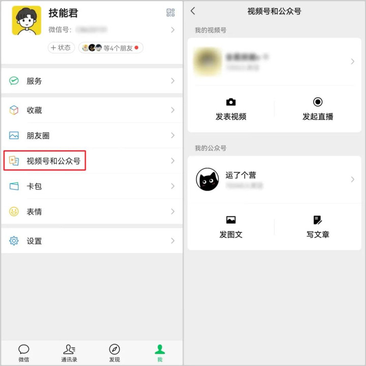在微信“我”界面,原“视频号”入口现已改为“视频号和公众号”,将两个创作入口合并后,可快速开启编辑模式。