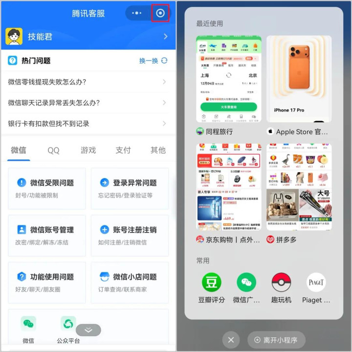 在小程序长按右上角圆形按钮后,弹出的小程序列表界面进行改版,现已调整为全屏模式,并以预览图的方式展示“最近使用”的四个小程序,以图标方式展示“常用”的四个小程序。